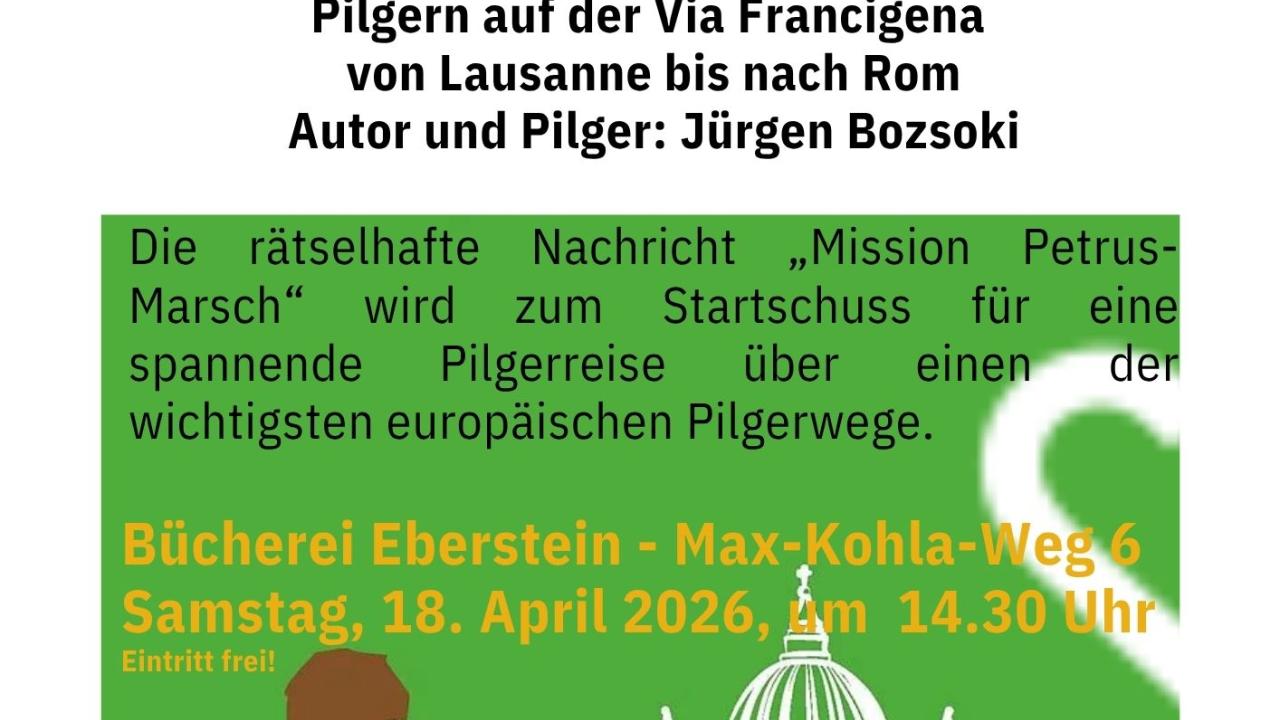 Die Bücherei Eberstein lädt am Samstag, dem 18. April 2026 um 14.30 Uhr zu einem besonderen Nachmittag rund um den „Mission Petrus-Marsch“ ein. Mit Lesung, Vortrag und Film nimmt Jürgen Bozsoki das Publikum mit auf seine Pilgerreise entlang der Via Francigena – von Lausanne bis nach Rom – und eröffnet persönliche Einblicke in einen der bedeutendsten europäischen Pilgerwege.