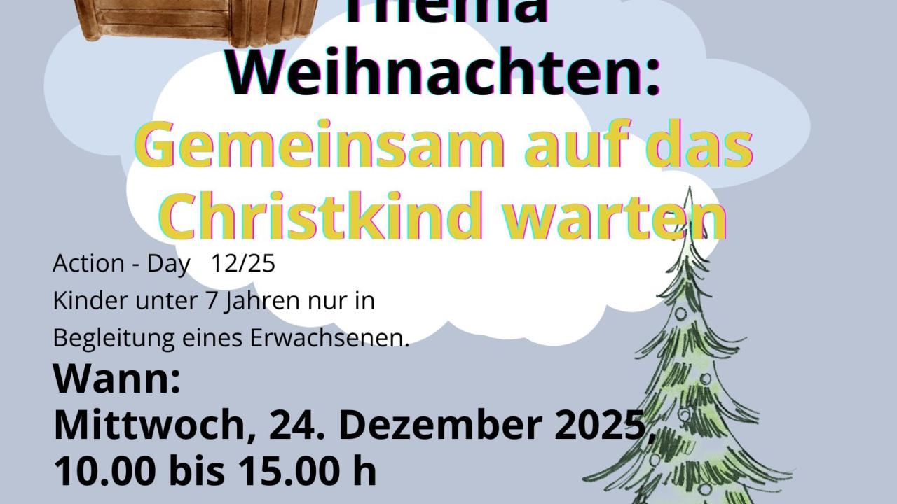 24.12.2025 Weihnachten Am 24. Dezember werden wir in der Zeit von 10 bis 15 Uhr gemeinsam auf das Christkind warten - mit kleinen Spielen, mit Singen und Lesen und die Bücherei erforschen.