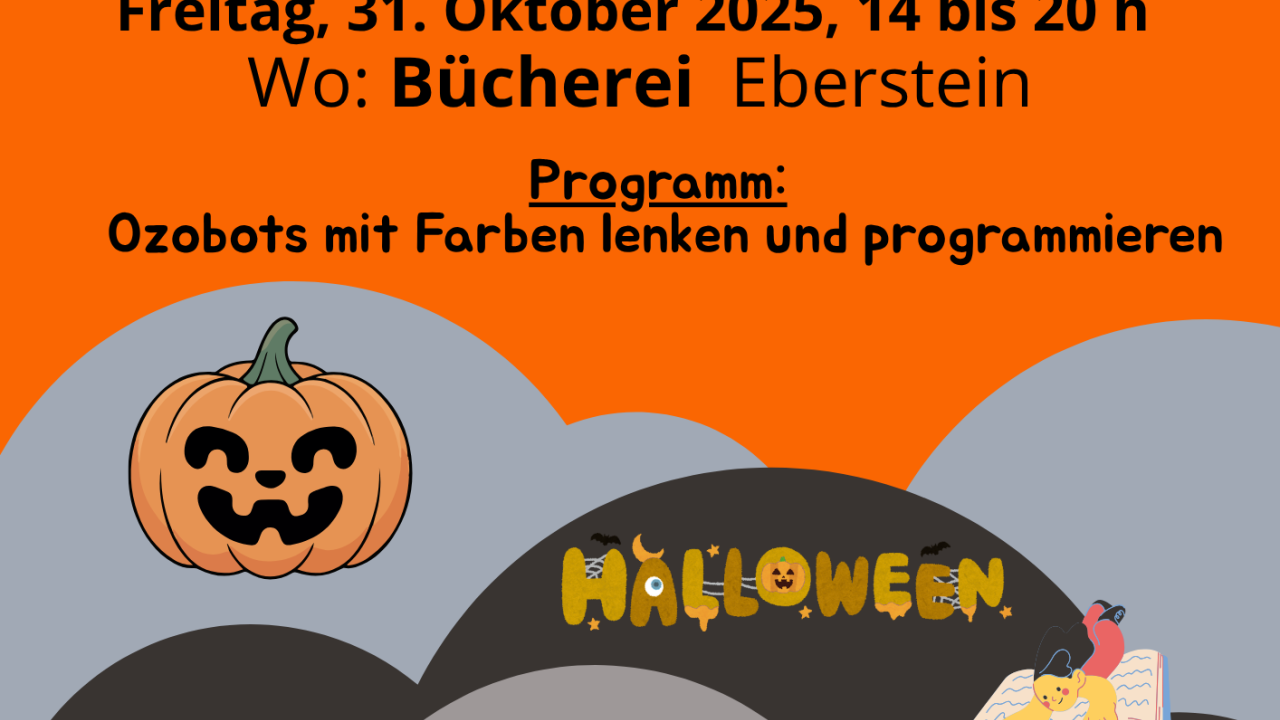 31.10.2025 Österreich liest 2025 Unser monatlicher Action-Day steht am 31. Oktober ab 15.00 Uhr im Zeichen von Robotic und Halloween. Die vier Ozobots warten mit Überraschungen auf viele Besucherinnen und Besucher.